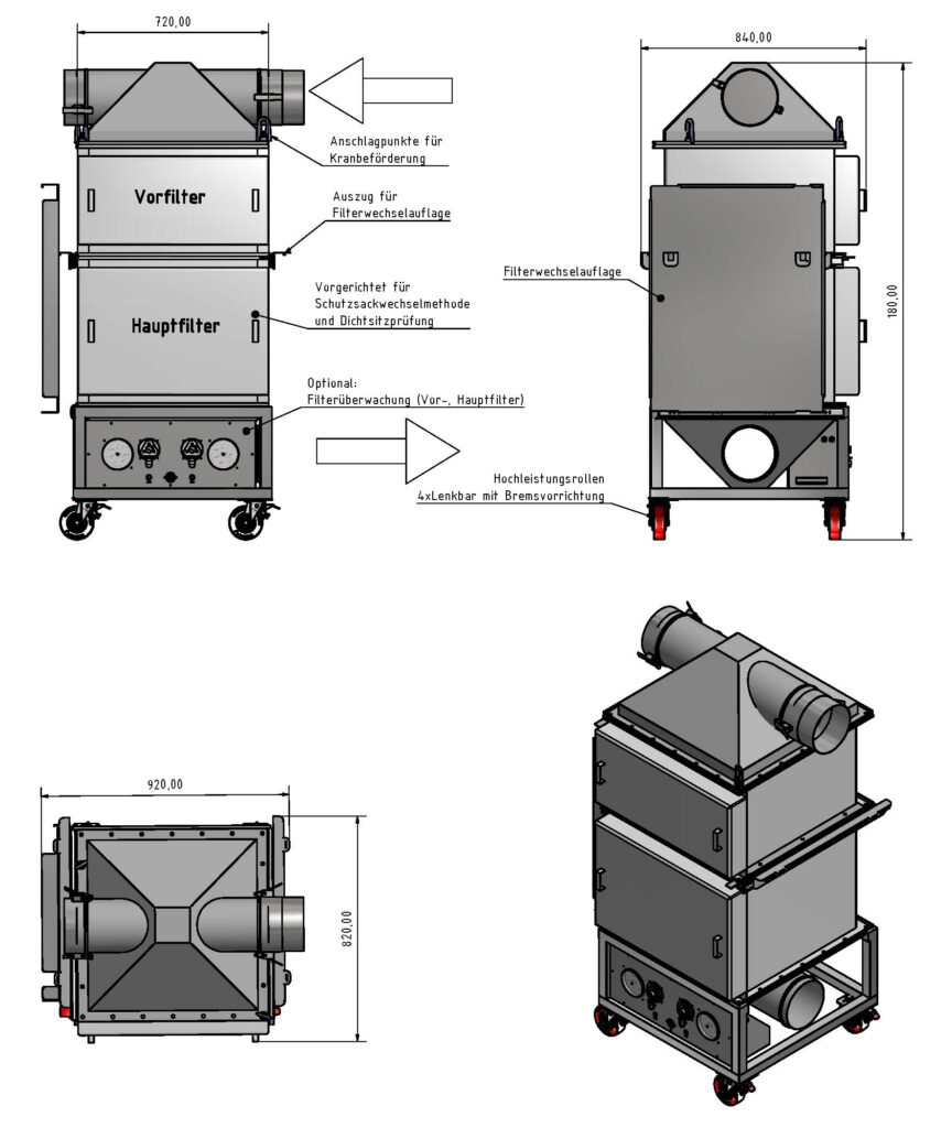 In der Grundausstattung bestehen sie aus einer Vorfilterstufe (610x610x150mm) und einem Hauptfilter (610x610x350mm).Sie können aber auch selbstverständlich in andere Kombinationen geliefert werden.